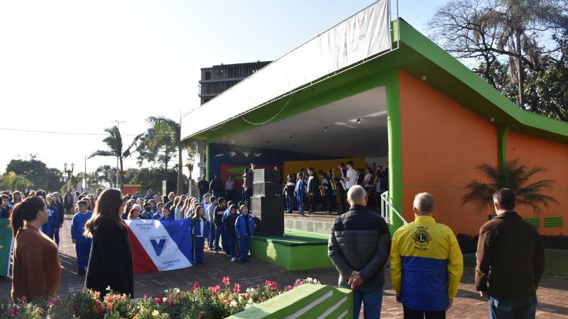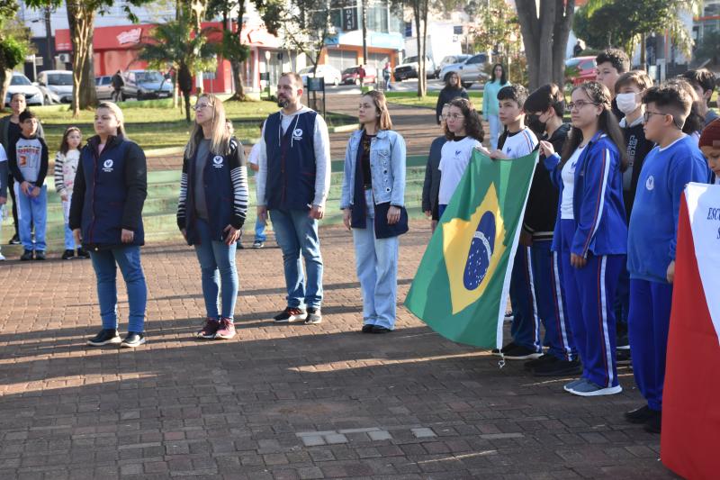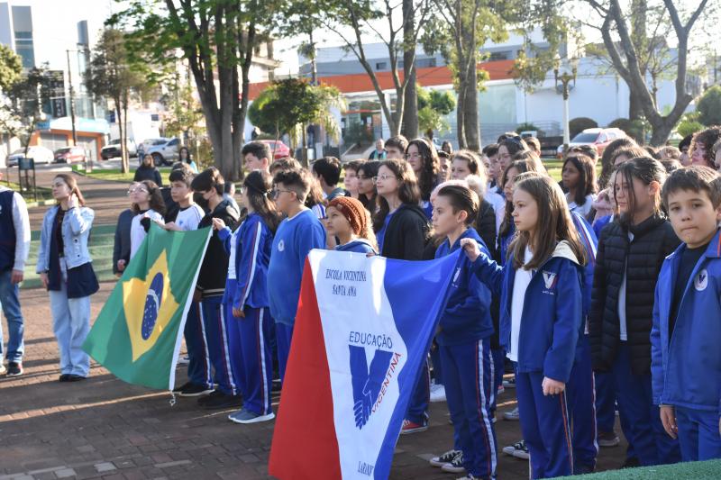 A Câmara Municipal de Laranjeiras do Sul, representada pelo 2° Secretário, vereador Ivaldonir Panatto, participou na manhã desta quinta-feira (1°), na Praça José Nogueira do Amaral, da cerimônia de hasteamento das bandeiras e execução dos hinos, marcando o início da Semana da Pátria. O evento é tradicionalmente realizado com a participação das escolas municipais e marcou a abertura oficial das comemorações pela data.