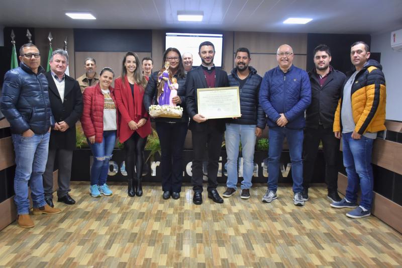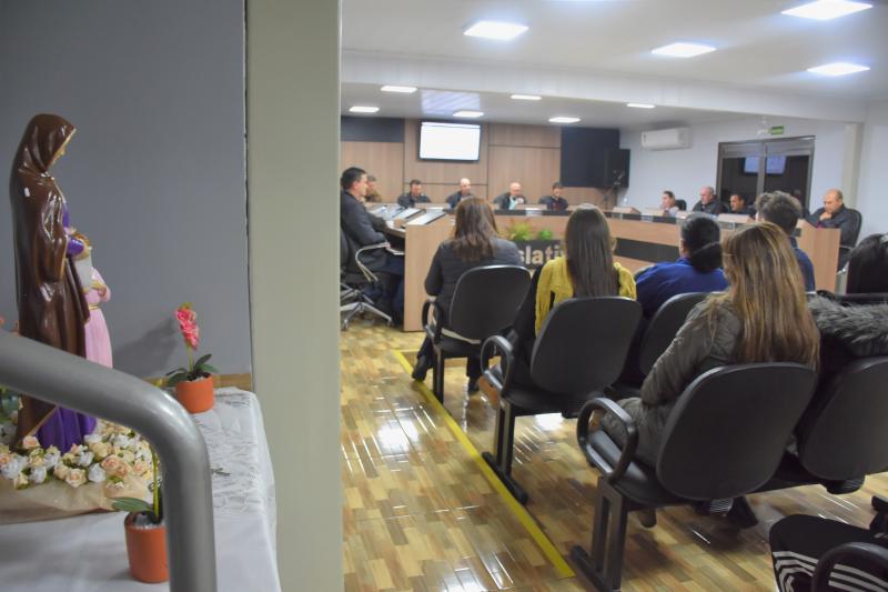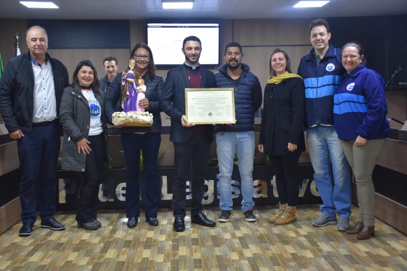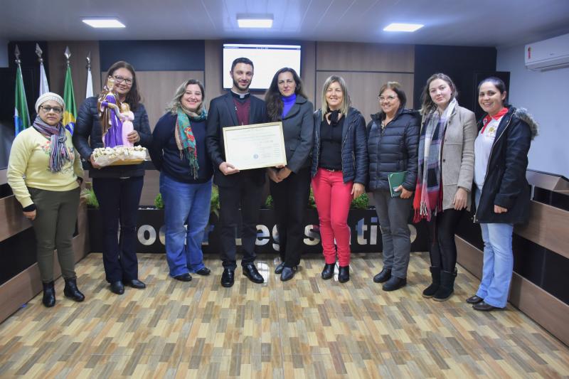 Presenças – Além de todos os parlamentares, estiveram presentes na sessão que marcou a entrega de uma Moção de Aplausos e Reconhecimento ao Diácono Anselmo Freski, os grupos religiosos Pastoral Familiar, Grupo Lareira e Jornada Jovem. Também participaram do ato os profissionais da educação municipal.