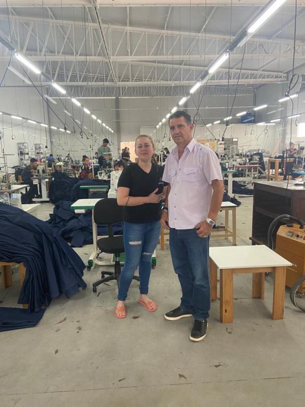 O vereador conversou com a Vânia, gerente da unidade no município, que apresentou a forma com que a empresa está trabalhando. “Eles fazem aqui em Laranjeiras todo o trabalho da a parte inicial de produção das calças Jeans e depois a parte final é realizada em Quedas, na sede na empresa”, conta o vereador.
