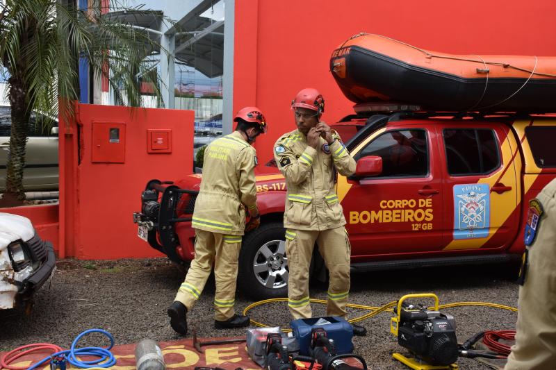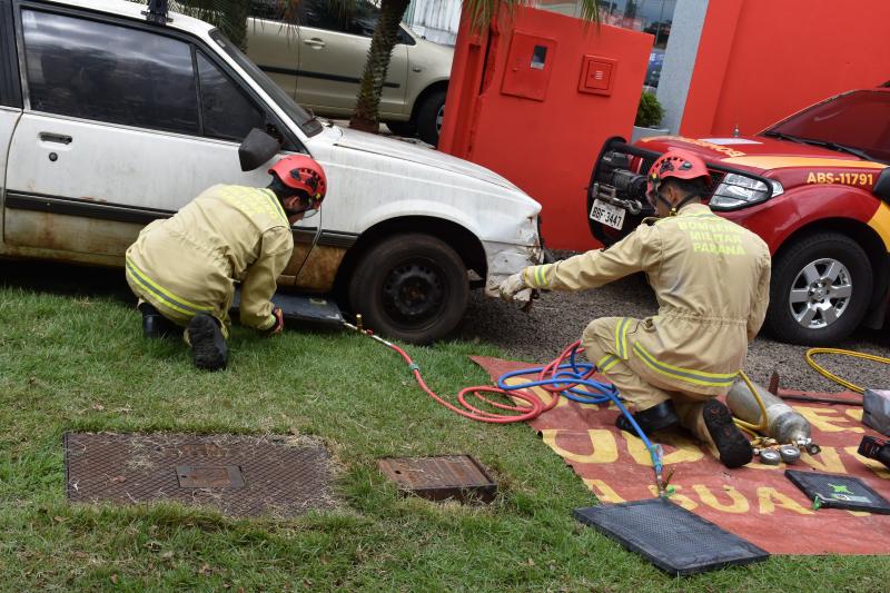 Também na demonstração, um carro foi erguido em poucos segundos com as almofadas pneumáticas que também dão agilidade ao resgate de vítimas que por acidente possam ficar debaixo de veículos.