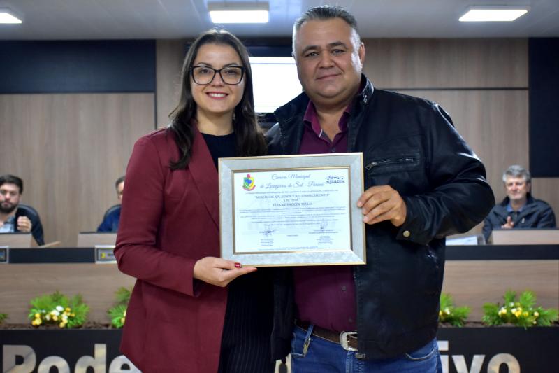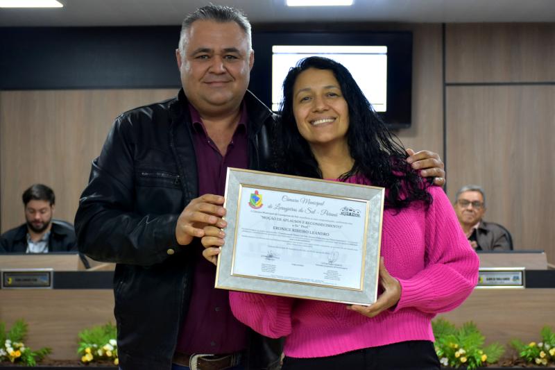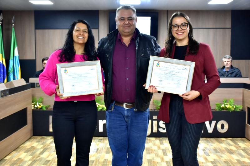 Durante a 27ª Sessão Ordinária da Câmara Municipal, realizada nesta segunda-feira, 25 de agosto, as professoras Eronice Ribeiro Leandro e Eliane Faccin Melo foram homenageadas com uma Moção de Aplausos e Reconhecimento, concedida pelo Legislativo em razão da conquista de um prêmio nacional na área de sustentabilidade. As educadoras venceram um concurso nacional com o projeto “Transformando plástico em vida: hortas e pufes para um futuro sustentável”, que utiliza resíduos plásticos na construção de hortas escolares e pufes, promovendo educação ambiental, criatividade e conscientização entre os alunos.