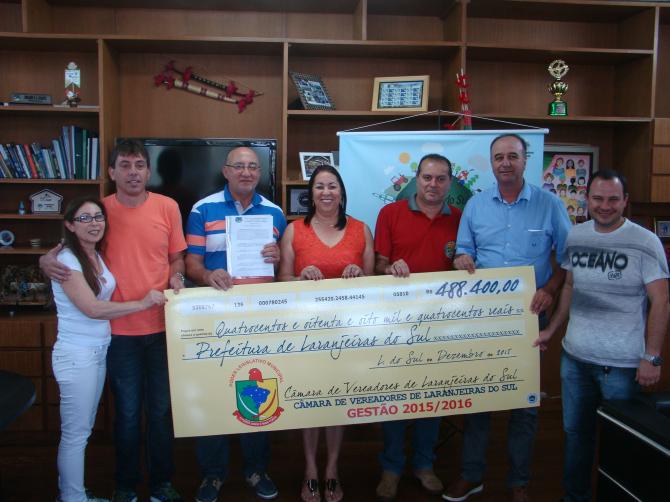 Em ato realizado na tarde desta segunda-feira (28), a prefeita Sirlene Svartz recebeu um cheque simbólico no valor de R$ 488.400,00 referente a devolução de recursos do Poder Legislativo relativo ao ano de 2015 período em que o presidente da Casa de leis é o vereador Darci Massqueto. O recurso livre que já foi depositado na conta da prefeitura será utilizado em 2016, prioritariamente na área de mobilidade urbana, estiveram presentes no entrega o Presidente Darci Massuqueto,Vice-Presidente Carlos Alberto Machado(Magrão),2ºSecretário Elton Ruths e os vereadores Aldemar Becker, Ivone Portela e Laureci Leal, funcionários do legislativo e Secretários Municipais.