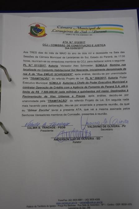 Além disso, a Comissão de Obras, Agroindústria, Comércio e Turismo, constituída pelos vereadores Carlos Machado Magrão, Ney Becker e Valmir Sete discutiram sobre o projeto 011/2017 de autoria do vereador Alex Schroeder que decide nominar a rua localizada no Conjunto Habitacional Sol Nascente, inicialmente denominada de rua A para "Rua Emílio Schroeder". Após maiores estudos, os membros decidiram pela Aprovação.
