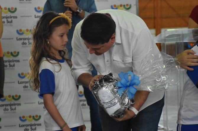 Na tarde da última quarta-feira (27), vereadores prestigiaram a entrega de 4 mil conjuntos escolares para alunos da rede municipal de ensino. A iniciativa da Prefeitura de Laranjeiras, por meio da Secretaria de Educação, tem por objetivo garantir a igualdade entre os estudantes e proporcionar segurança na identificação das crianças. O kit contém duas camisas, uma calça, jaqueta, duas meias e um tênis.