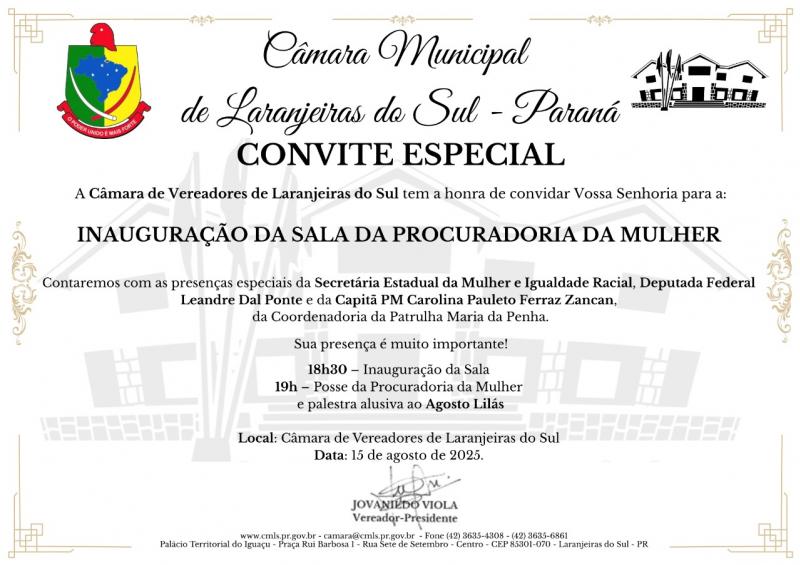 Câmara de Laranjeiras do Sul realizará cerimônia de instalação da Procuradoria da Mulher
